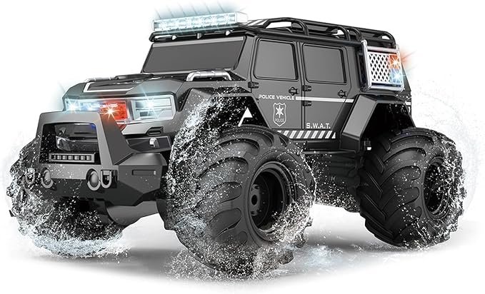 This RC Police SWAT Off-Road Vehicle is a powerful and rugged remote control truck designed for thrilling action play. Featuring a bold black police SUV design with realistic SWAT detailing, roof lights, and a heavy-duty body structure, this monster truck delivers an exciting driving experience for kids.