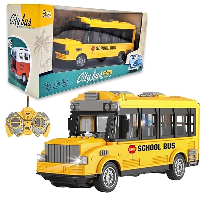 This 27MHz RC City School Bus is a bright yellow remote control toy designed for kids aged 3+ years. It features forward, backward, left, and right movement with an easy-to-use controller. Made from durable plastic with realistic school bus detailing and light effects, it is perfect for indoor play and makes a great gift for children.
